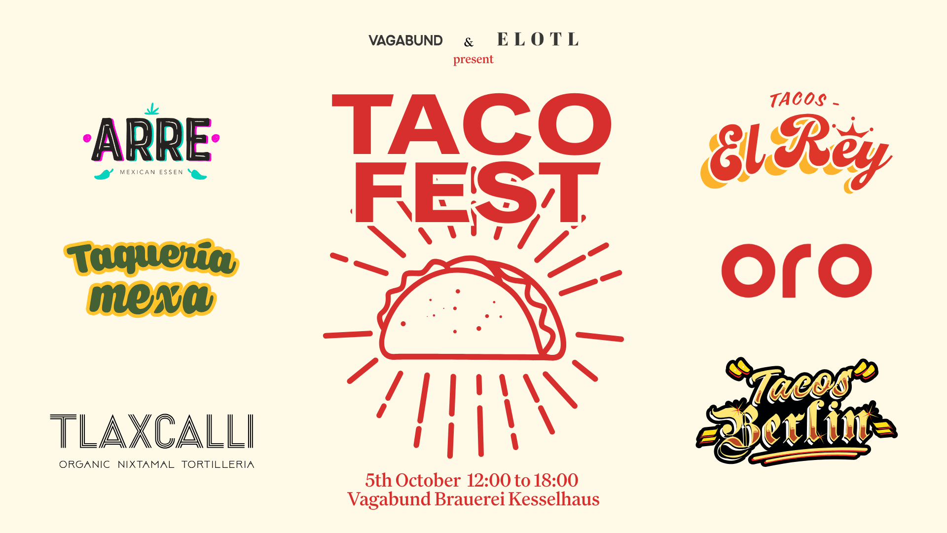 Vagabund & Elotl present: The Taco Festival 1.0! Come celebrate the art of the taco with us at Vagabund Kesselhaus: the best taquerías in Berlin, all in one place! Sunday 5th October from 12:00 to 18:00